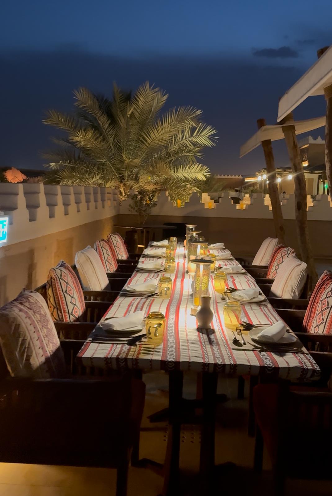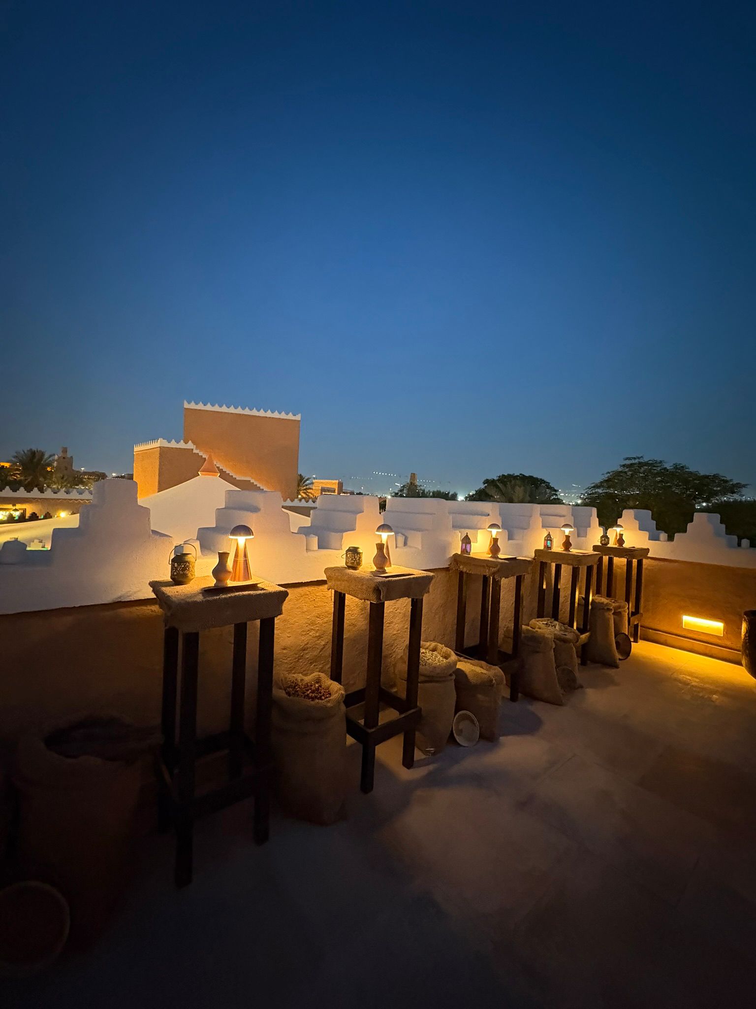 As the sun sets over the wadi, ascend to a private Bujairi terrace overlooking the illuminated ruins of At-Turaif. Here, an unforgettable evening unfolds — a high-end Saudi tasting menu crafted to showcase the finest flavors and aromas of the Kingdom. Each course is paired with a multisensory journey celebrating local heritage, from discovery tables featuring authentic Bedouin artifacts to live oud music, calligraphy, and henna artistry.